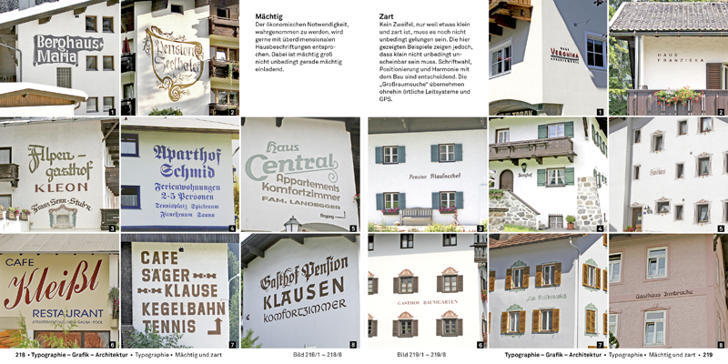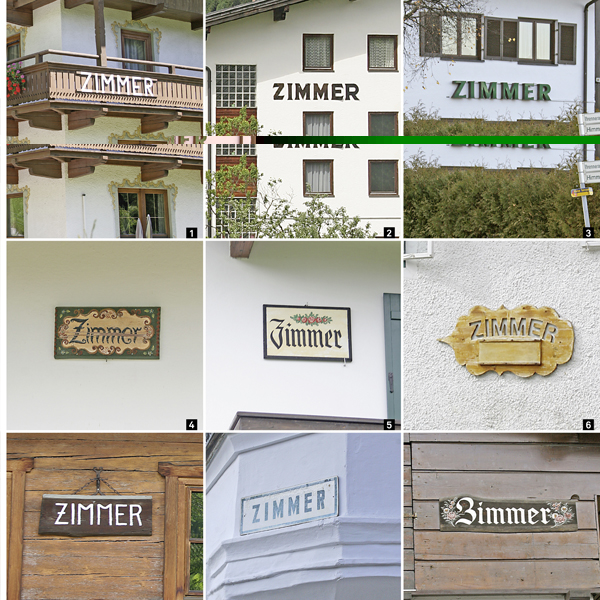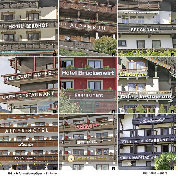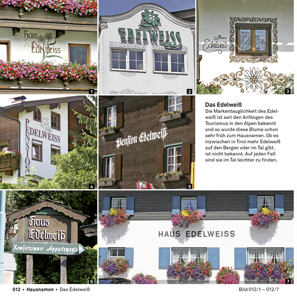 Ursprünglich von den Touristen aus der Stadt mitgebracht, fanden die Hausnamen im Alpenraum einen äußerst fruchtbaren Boden. Die immer zahlreicheren Gast- und Gästehäuser benötigten immer mehr Namen und Beschriftungen, die sich schließlich zu einem eigenen typo-graphischen und semiotischen Geflecht entwickelten.